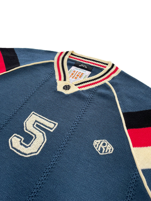 This short-sleeved knitwear is knitted on a home machine, with all the details of a soccer team's game shirt. It uses soft, supple wool-blend worsted yarn. The body is knitted in a tuck pattern.