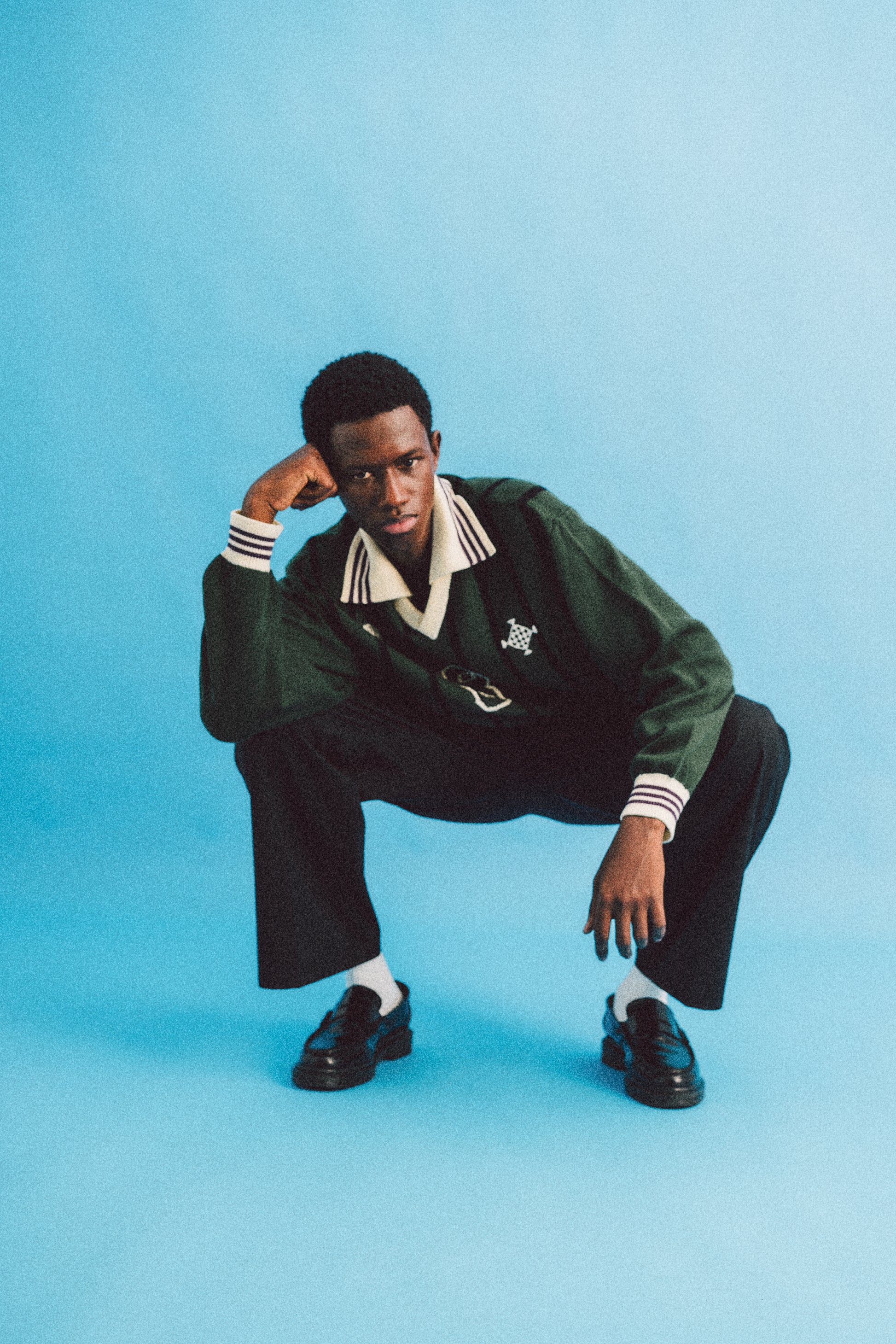 A home-knitted long-sleeve knitwear with all the details of a soccer team's game shirt. Made with soft, supple wool-blend worsted yarn. Striped front and back. Color-coordinated lines on collar and cuff ribbing. Graphics on both chests and numbers on front and back are all hand-embroidered.