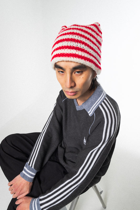 Sold outHAND KNITTED STRIPED BEANIE (RED)