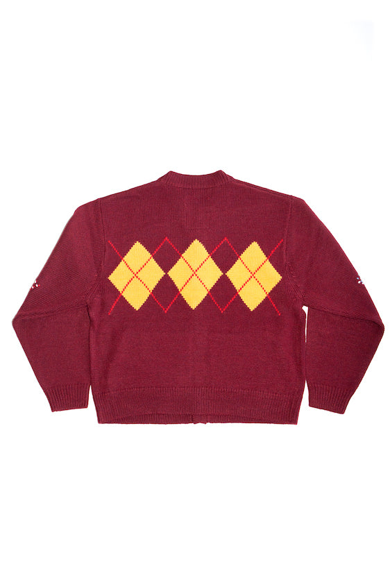 The front and back of the body are argyle patterned, and the elbows are hand-embroidered with color-coordinated stitching and motifs.