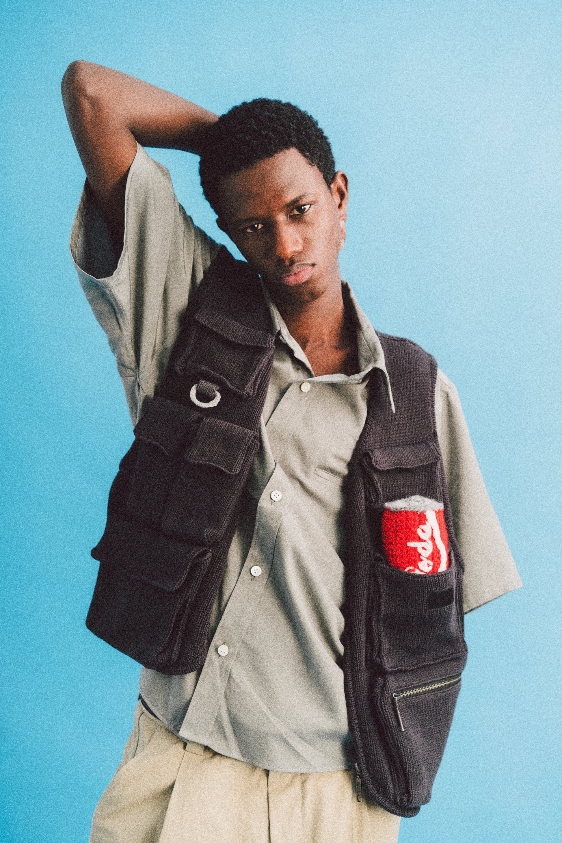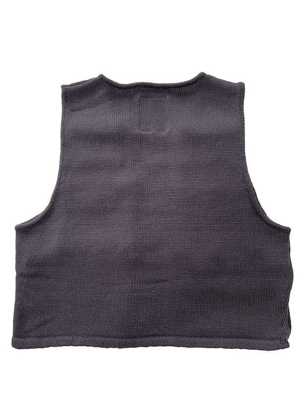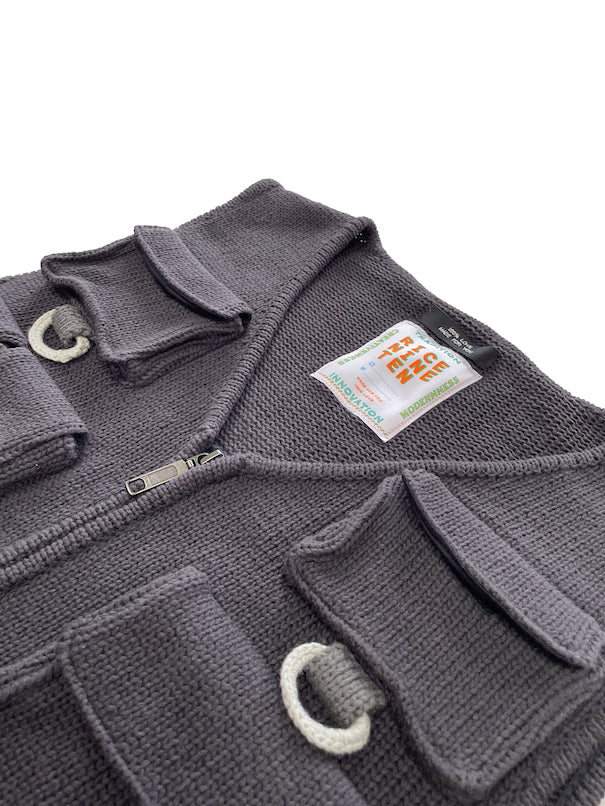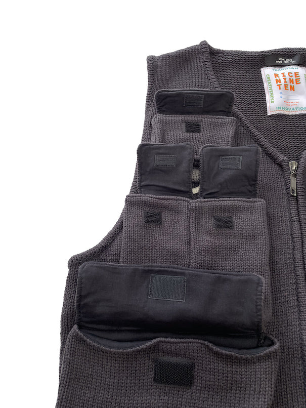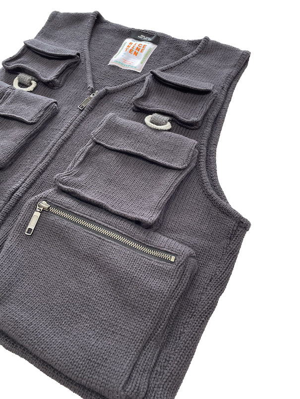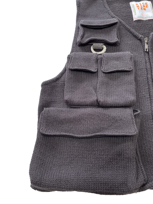 This cotton knit vest is knitted on a home machine, with all the details of a fishing vest. All of the gusseted multi-functional pockets are lined with cotton fabric.