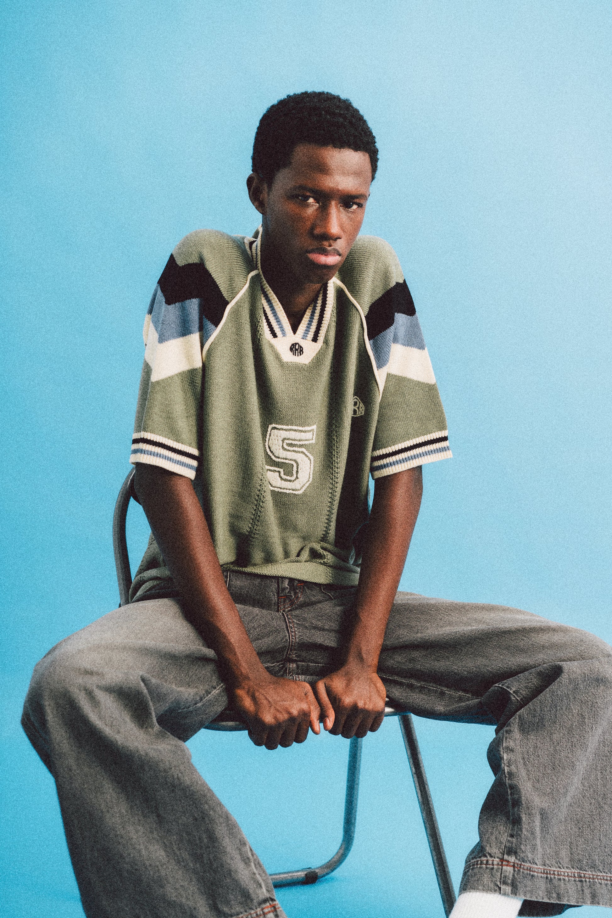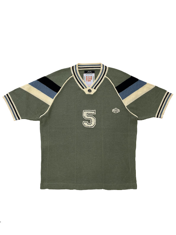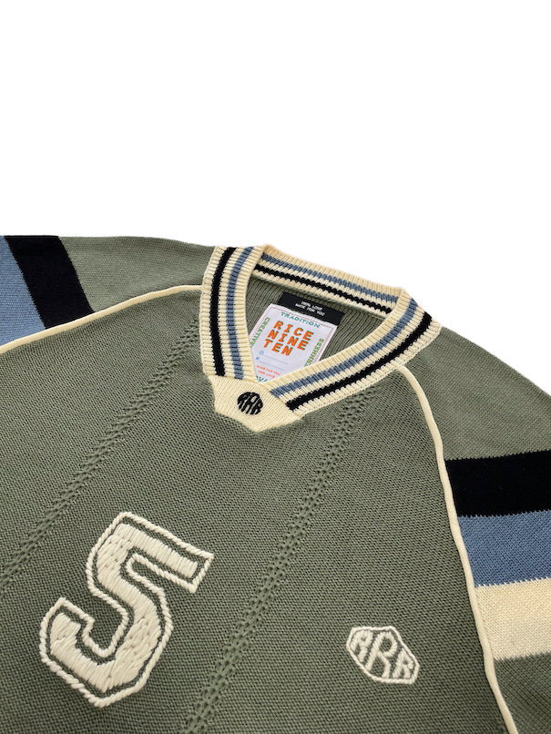 This short-sleeved knitwear is knitted on a home machine, with all the details of a soccer team's game shirt. It uses soft, supple wool-blend worsted yarn. The body is knitted in a tuck pattern.