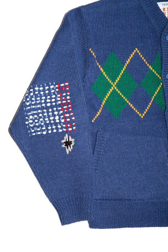 The front and back of the body are argyle patterned, and the elbows are hand-embroidered with color-coordinated stitching and motifs.