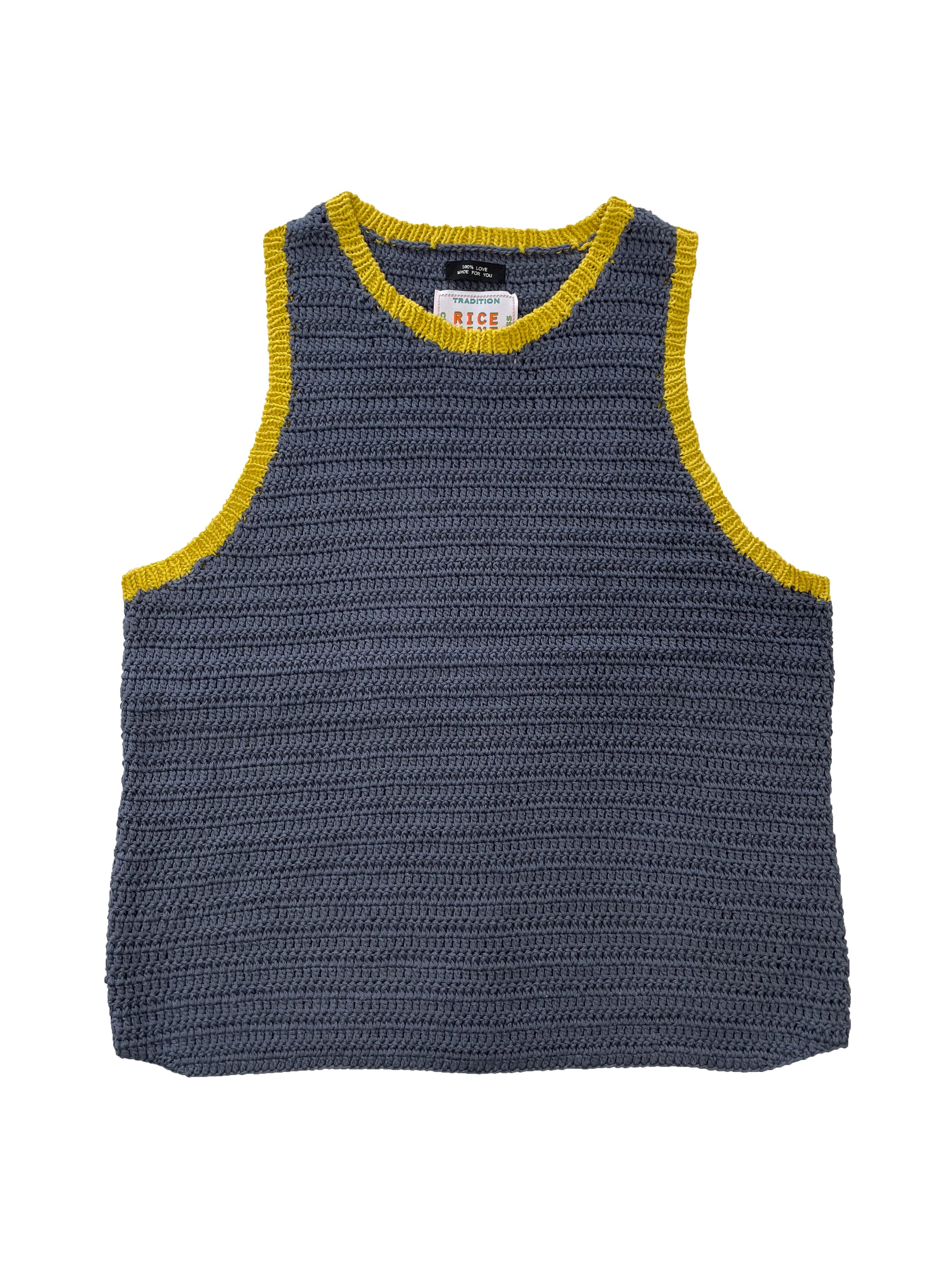 UV カット加工のコットン糸を使用した鈎針編みのタンクトップ。 首周り、脇周りは配色のリブ編み。