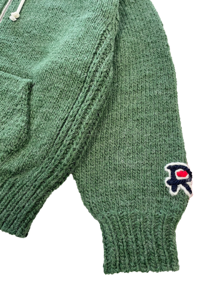 겨드랑이의 사이드 패널, 푸드의 아일렛 등, 빈티지 스웨트 파커와 같은 디테일을 모두 손으로 짜로 표현한 Zip 업 푸디 스웨터. 왼쪽 소매에는 R 마크의 손 자수. 후드에는 드로우 코드 첨부. 캥거루 포켓 있음. 2번째 털실을 2개 취(2배량의 실)로 짜는 것으로 확실한 두께를 내고 있다.
