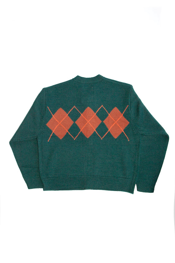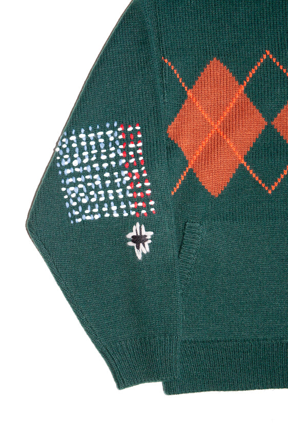 前後身頃はアーガイル模様。 肘には配色のステッチとモチーフが手刺繍されている。
