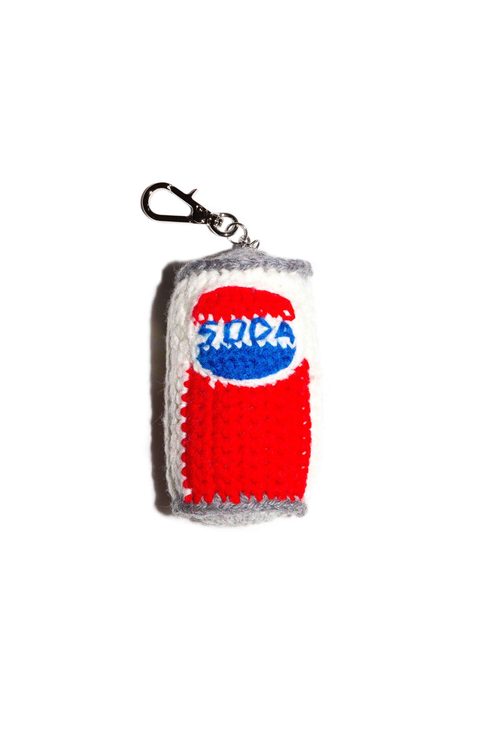 ソーダ缶ををモチーフにした手編みのぬいぐるみキーリング。