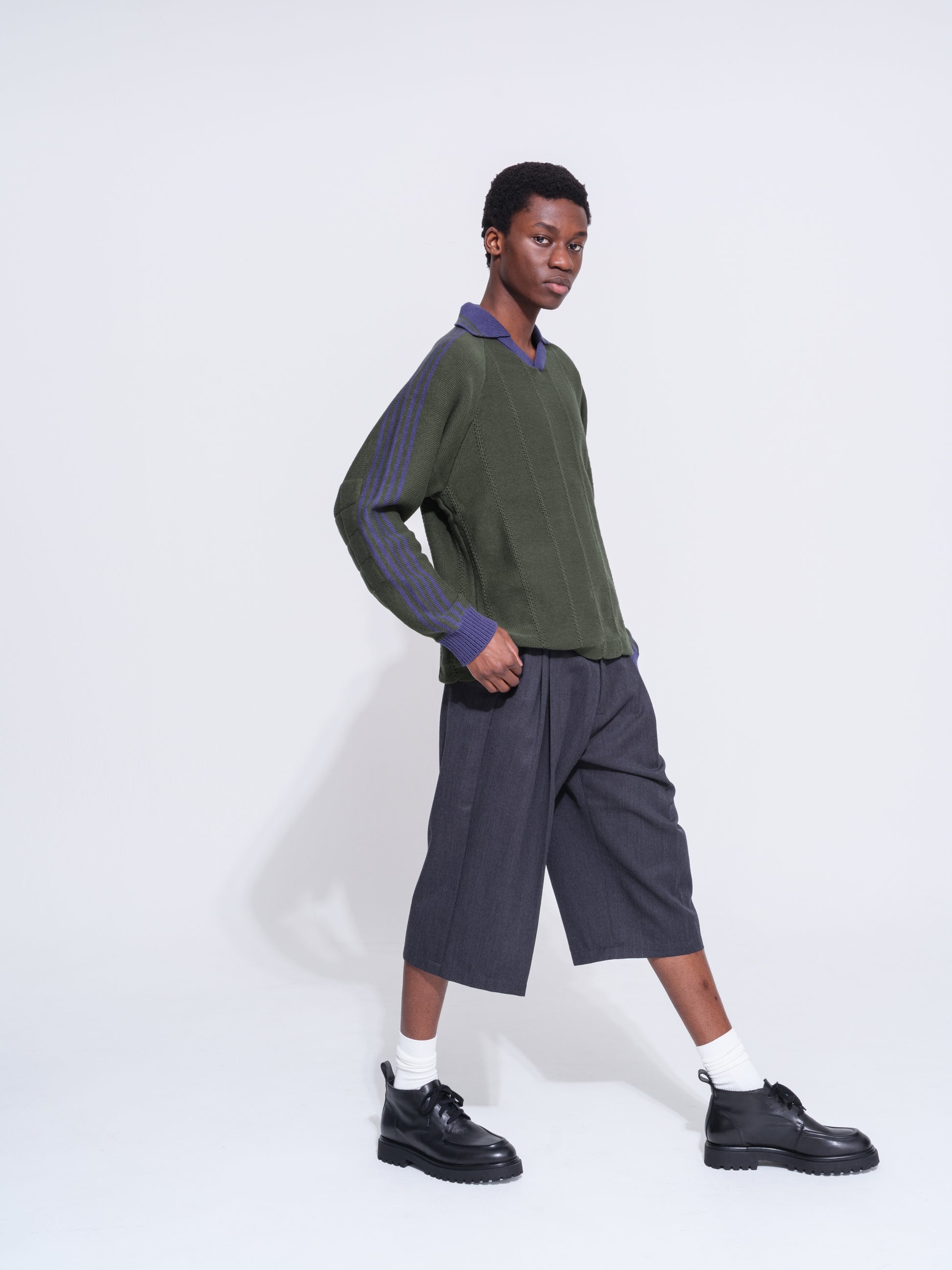 袖、衿に 配色ライン。 左胸のグラフィックは手刺繍。