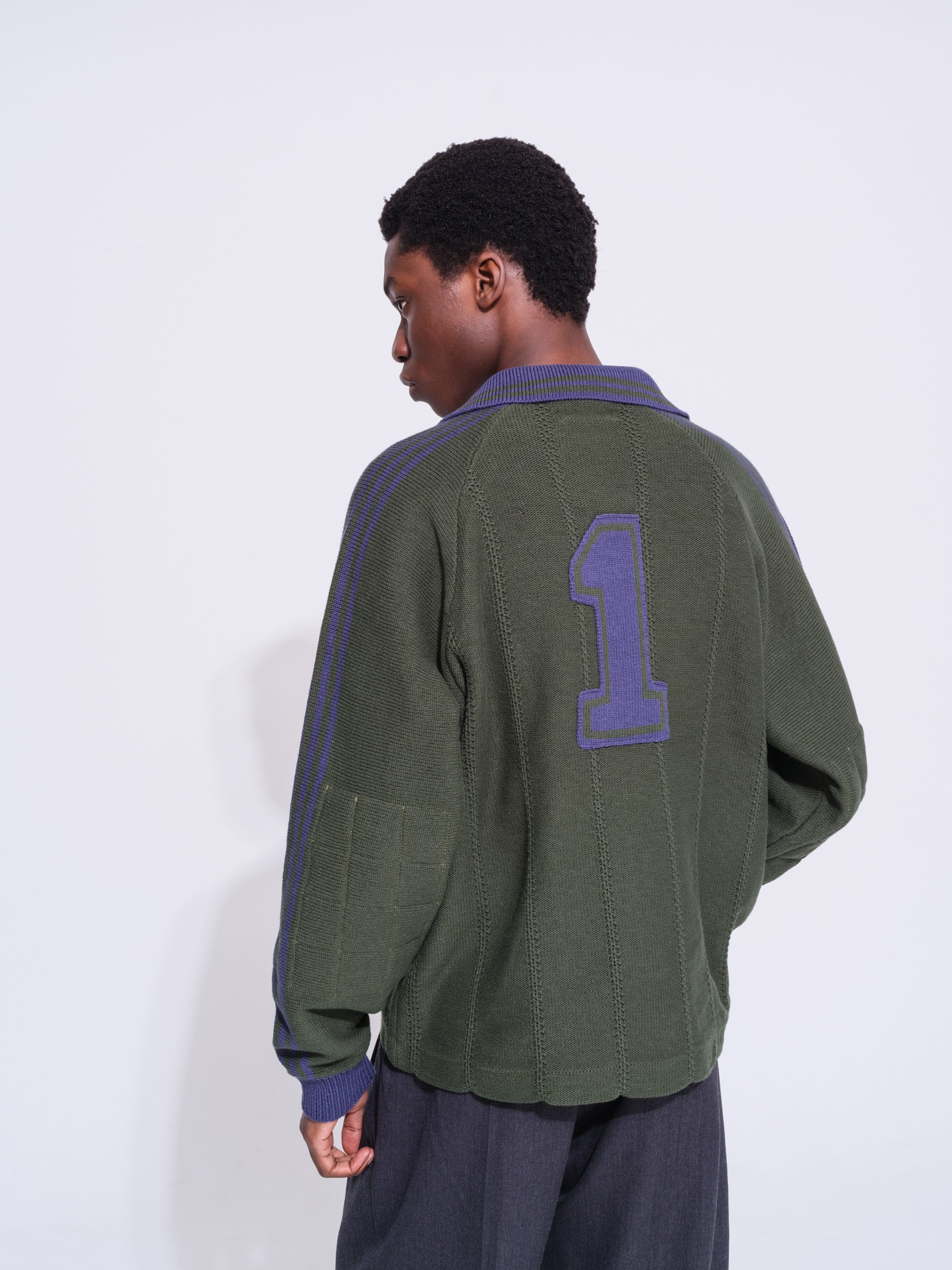 肘にはパッド、格子ステッチを入れ編みつけたエルボーパッチ有り。