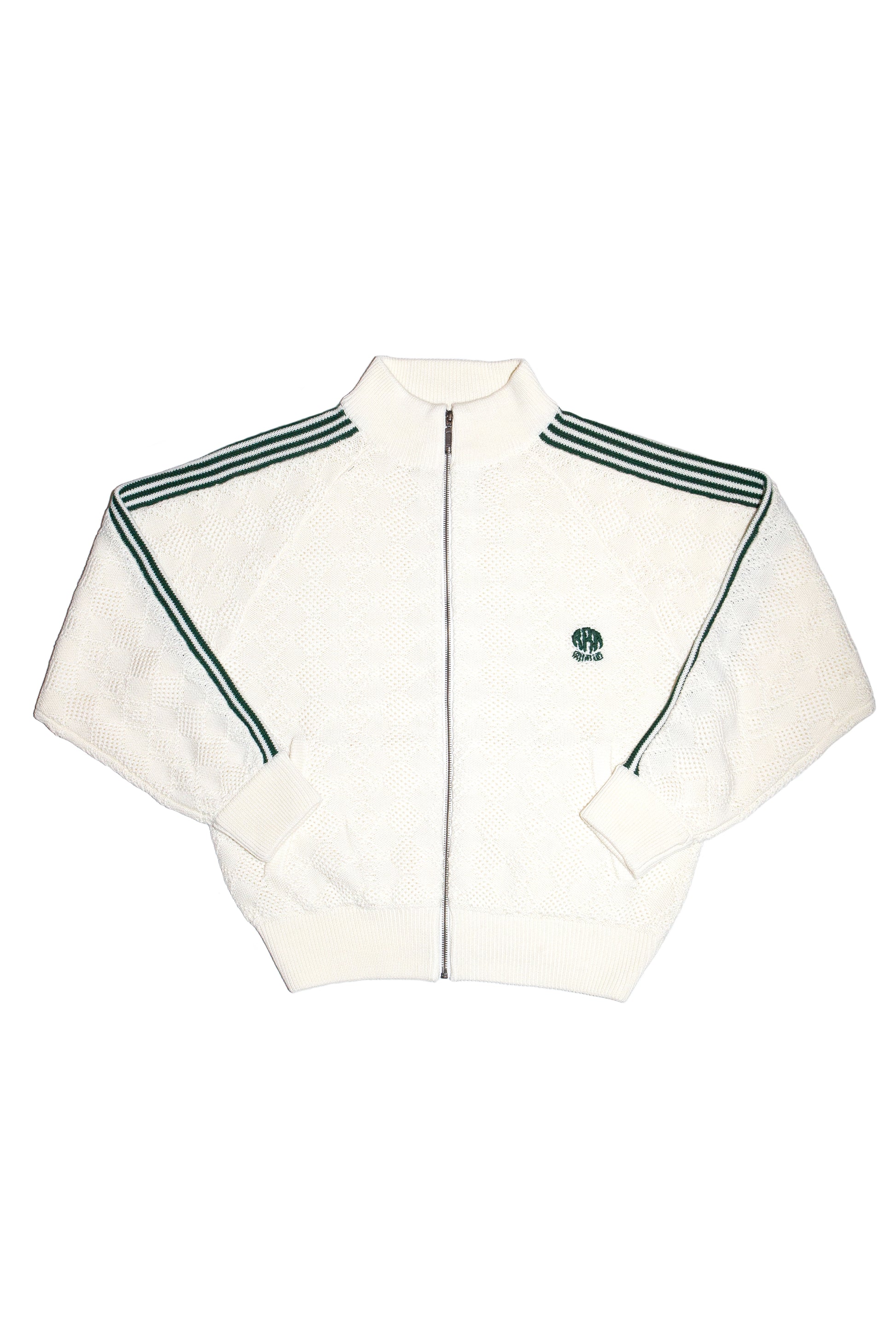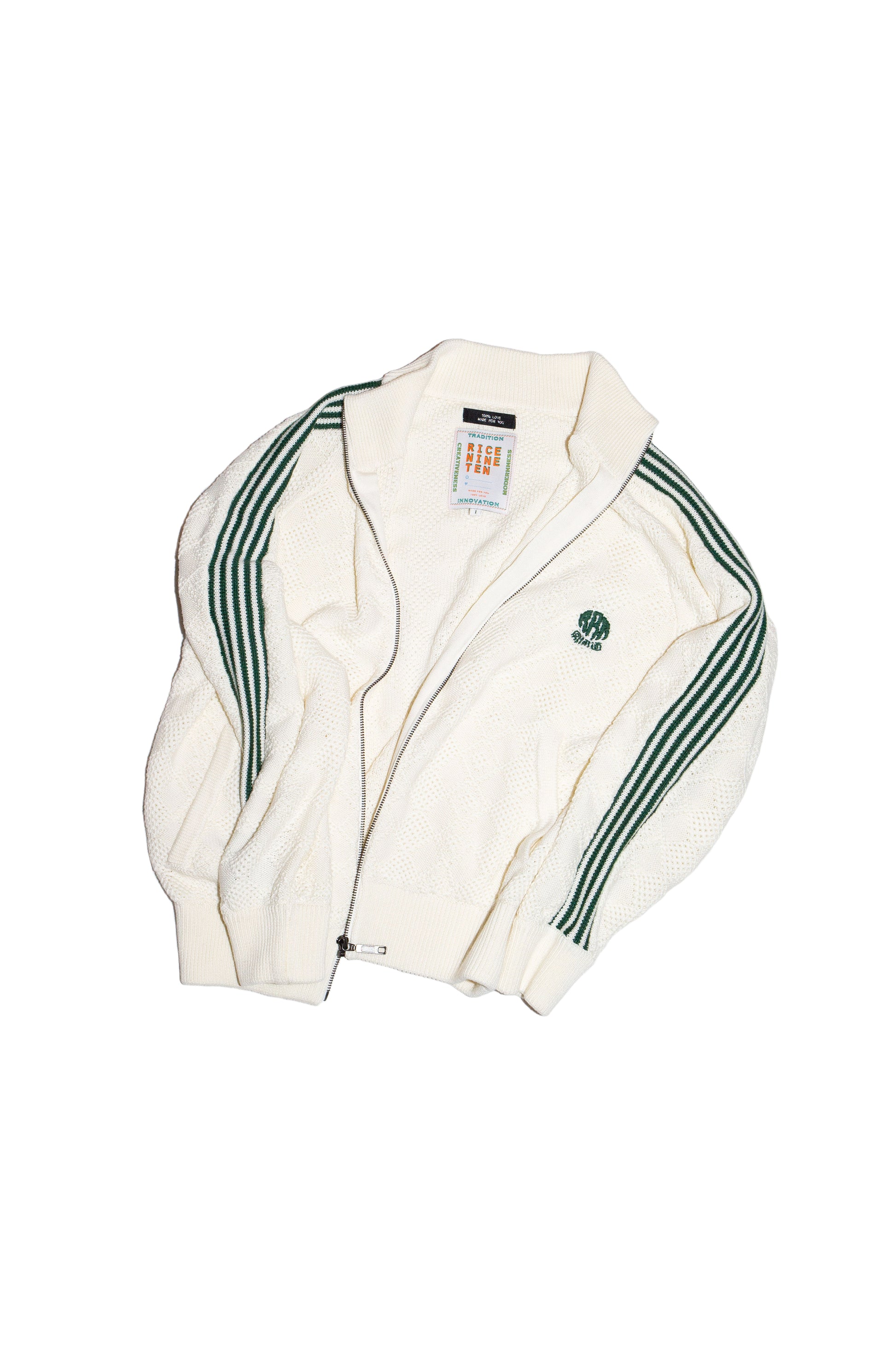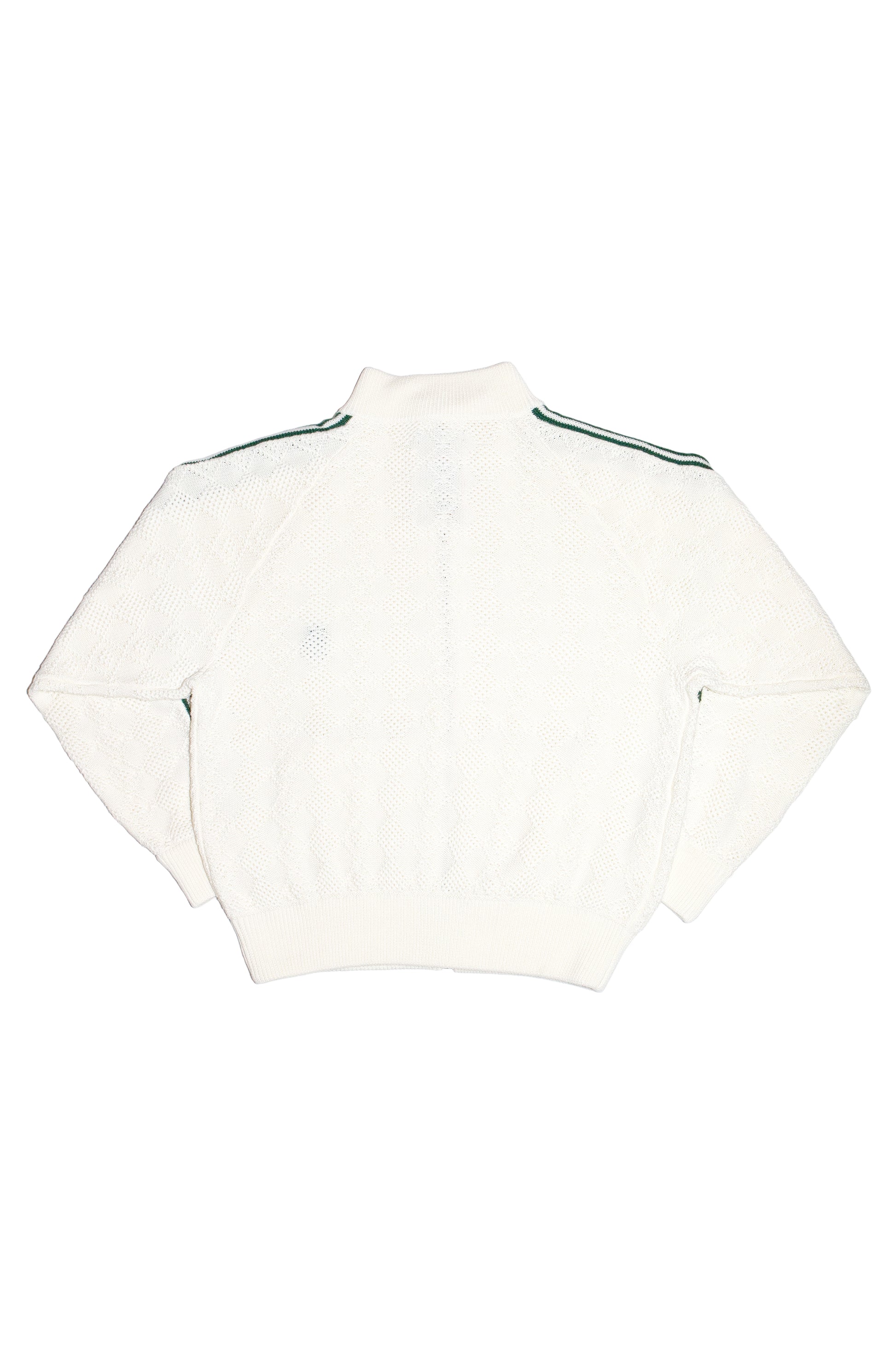 本体は模様編み。首元、袖口、裾はリブ編み。袖には配色 5 本ライン。
